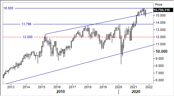 Graficamente, la estesa reazione successiva al crollo del marzo 2020 ha confermato la solidità della borsa tedesca, la prima in Eurozona a riportarsi oltre i llivelli pre-pandemia. La violazione di area 13.800 punti ha impresso una svolta decisa al movimento rialzista con obiettivi finali intorno a 18.700 punti. L'uscita dal canale crescente sotto evidenziato ha ulteriormente rafforzato il quadro di fondo.