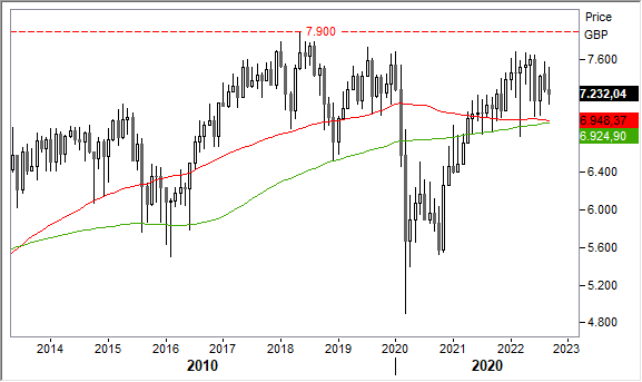 Analisi Tecnica. Il quadro di fondo dell'indice FTSE 100 (oggi 7.232 punti) rimane saldamente rialzista ed è uno dei più resilienti di quest'anno. La prima soglia discriminante, posizionata sulle due medie mobili di lungo periodo verso 7mila/6.900 punti, sta sorreggendo l'uptrend.