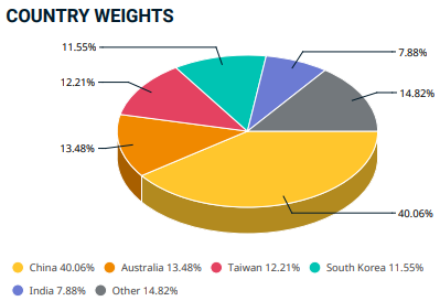 Come illustra la tabella seguente, la Cina è il Paese con il maggior peso specifico, seguita da Australia, Taiwan, Corea del Sud e India. Insieme rappresentano l'85% circa del totale.