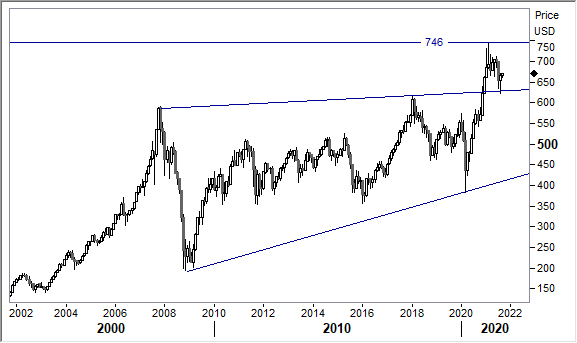 Operatività. Si suggerisce di sfruttare l'incertezza per costruire una posizione di lungo periodo, accompagnando il rialzo con acquisti scalettati. Eventuali correzioni verso 600/580 punti sono occasioni per comprare sulla debolezza. Primo target 740 punti. Target finale 800 punti.
