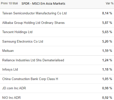 Insieme, Finanziari, Tech e Consumer Discretionary pesano per il 55% del totale. Tra le società con il maggior peso specifico ci sono: Alibaba (Cina), Tencent (Hong Kong), Taiwan Semiconductor (Taiwan), Samsung (Corea del Sud), insieme pesano per circa il 18% del totale.