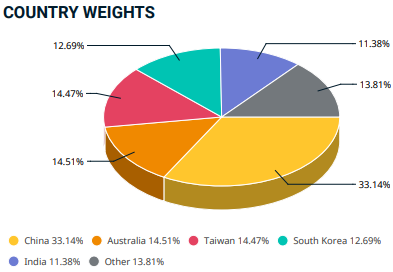Come illustra la tabella seguente, la Cina è il Paese con il maggior peso specifico, seguita da Australia, Taiwan, Corea del Sud e India. Insieme rappresentano l'85% circa del totale.