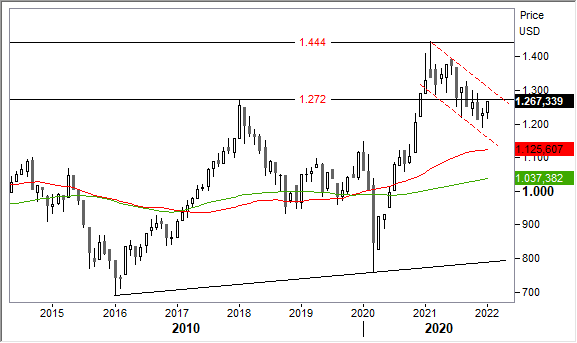 Quadro grafico. Dal picco record a 1.444 punti del febbraio 2021 è partita la fase correttiva tuttora in corso. Il rimbalzo di questo avvio d'anno ha riportato l'indice a ridosso della prima soglia discriminante in area 1.272 punti, ex massimo del 2018. Alziamo l'allerta perchè il superamento stabile di questa resistenza potrebbe avviare una nuova fase rialzista, aprendo la strada al ritorno in direzione dei top assoluti. Precisiamo in ogni caso che la tendenza rialzista di fondo non è venuta meno come illustra la costante tenuta delle medie mobili sotto evidenziate, ad esclusione del breve shock subito nel momento dello scoppio della pandemia.
