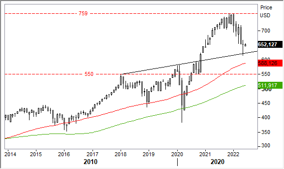 Operatività. Manteniamo il giudizio positivo di lungo periodo. Comprare questo indice significa partecipare alla rinascita dell'economia globale post-coronavirus e post-guerra in Ucraina con la garanzia della massima diversificazione del rischio. Si suggerisce di sfruttare sistematicamente correzioni verso 620/600 punti per comprare sulla debolezza. Incrementare alla prima chiusura sopra 700 punti per target di breve verso 760 punti. Cambio di scenario ed eventuale stop loss da applicare in caso di chiusura sotto 580 punti.