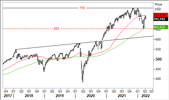 Operatività. Manteniamo il giudizio positivo di lungo periodo. Comprare questo indice significa partecipare alla rinascita dell'economia globale post-coronavirus e post-guerra in Ucraina con la garanzia della massima diversificazione del rischio. Si suggerisce di sfruttare sistematicamente correzioni verso 660 punti per comprare sulla debolezza. Incrementare alla prima chiusura sopra 730 punti per target di breve verso 760 punti. Cambio di scenario ed eventuale stop loss da applicare in caso di chiusura sotto 650 punti.