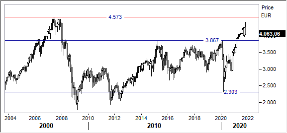 Analisi tecnica. L'indice Eurostoxx 50 (oggi 4.064 punti) ha segnato i massimi degli ultimi tredici anni lo scorso 19 novembre a 4.415 punti, avvicinandosi al picco record del 2007 in area 4.573 punti. La tendenza di fondo rimane saldamente rialzista finchè si resta sopra la soglia discriminante di lungo periodo a 3.867 punti. Crediamo che le recenti turbolenze potrebbero favorire la prosecuzione della fase di assestamento con ulteriori flessioni.