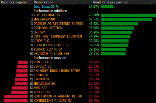 La tabella allegata illustra i migliori/peggiori performer da inizio anno dell'indice. Al primo posto ASML (semiconduttori), seguita da ING (Banche) e Daimler (Automotive).