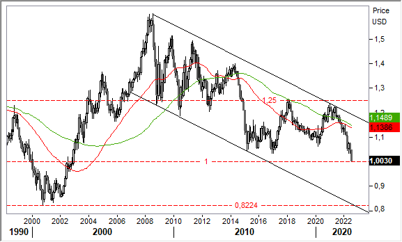 Analisi Tecnica. La tendenza di fondo è saldamente favorevole al Dollaro USA, come si evince dal canale discendente del cross Euro Dollaro sotto evidenziato sia sul breve che sul lungo termine. Il cedimento del fortissimo supporto statico in area 1,035 ha provocato l'accelerazione tuttora in corso, con oibettivi di breve verso la parità (1,0), parte bassa del canale evidenziato nel primo grafico.