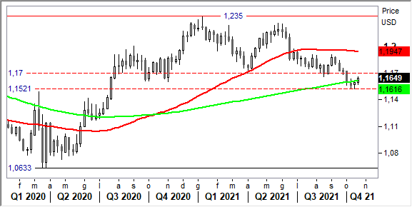 Il cross Euro/Dollaro (1,1650) sale ai massimi di ottobre, è il quinto rialzo consecutivo. Il cross si allontana dai minimi da luglio 2020 segnati il 12 ottobre a 1,152.