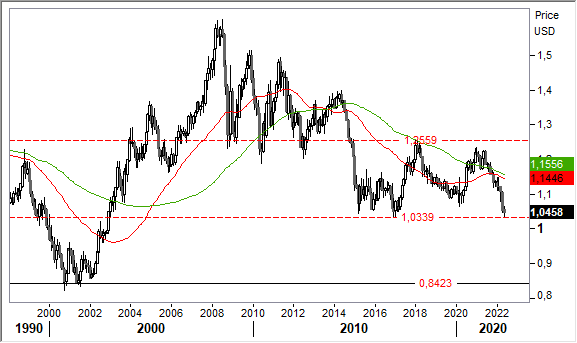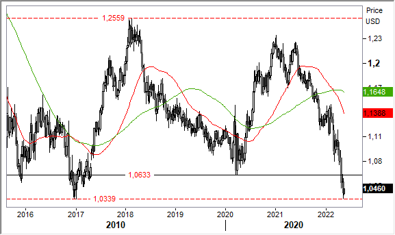 Operatività. Per trading è lecito sfruttare la discesa nel range 1,06/1,034 per prendere profitto in attesa di un assestamento. Teniamo comunque alta l'allerta perchè una chiusura convinta sotto 1,03 potrebbe spingere il cross in direzione dei minimi pluriennali di inizio millennio in area 0,80 con uno step intermedio intorno alla parità (1).