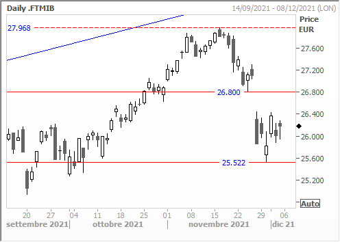Operatività. Confermiamo la visione positiva. Scattatii primi acquisti sulla debolezza verso 26mila punti, collochiamo un secondo intervento verso la soglia discriminante in area 25mila/24.650 punti. Applicare uno stop prudenziale sotto 24.000 punti.