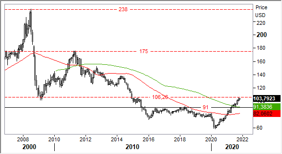 Graficamente, la ripartenza in atto ha fatto saltare un'area discriminante di forte valenza pluriennale, confermando l'inversione del trend ribassista di lungo periodo. Gli obiettivi grafici di medio termine sono ambiziosi. Ricordiamo infatti che l'indice BCOM arrivò a 238 punti nel momento di massima espansione dell'economia globale prima del crack di Lehman Brothers, per cui vediamo altro spazio di rialzo, nel breve almeno fino a 120/122 punti. Tendenza delle materie di base ancora da cavalcare.