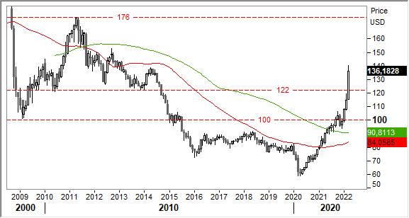 Graficamente, la brillante partenza del 2022 ha convalidato la figura di inversione del trend ribassista di lungo periodo. Gli obiettivi grafici di medio termine sono ambiziosi. Ricordiamo infatti che l'indice BCOM arrivò fno a 238 punti nel momento di massima espansione dell'economia globale prima del crack di Lehman Brothers. Tendenza delle materie di base ancora da cavalcare in ottica di lungo periodo.