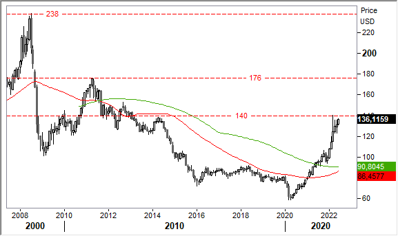 Graficamente, l'andamento da inizio 2022 ha convalidato la figura di inversione del trend ribassista di lungo periodo. Gli obiettivi grafici di medio termine sono ambiziosi. Ricordiamo infatti che l'indice BCOM arrivò fino a 238 punti nel momento di massima espansione dell'economia globale prima del crack di Lehman Brothers. Tendenza delle materie di base ancora da cavalcare in ottica di lungo periodo.