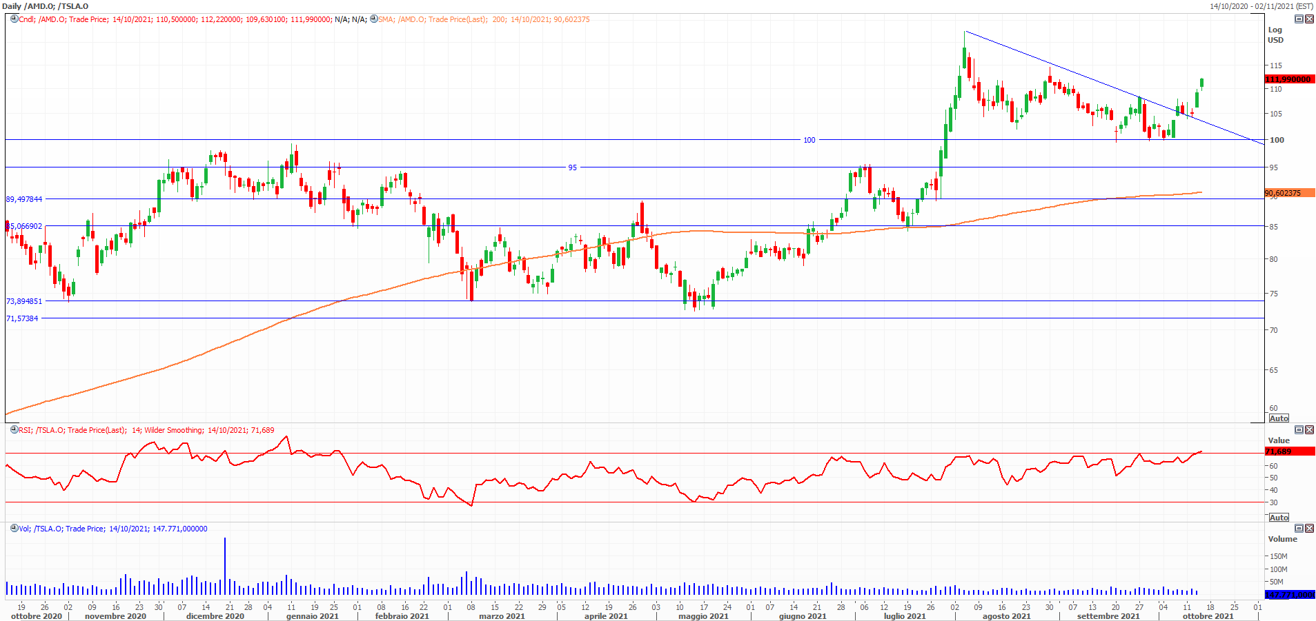 Newsflow. I risultati trimestrali di TSMC con utili sopra le attese ha portato a rialzi diffusi su tutto il comparto dei chip, tra cui anche AMD. Ricordiamo che la società pubblicherà i conti il 26 ottobre.