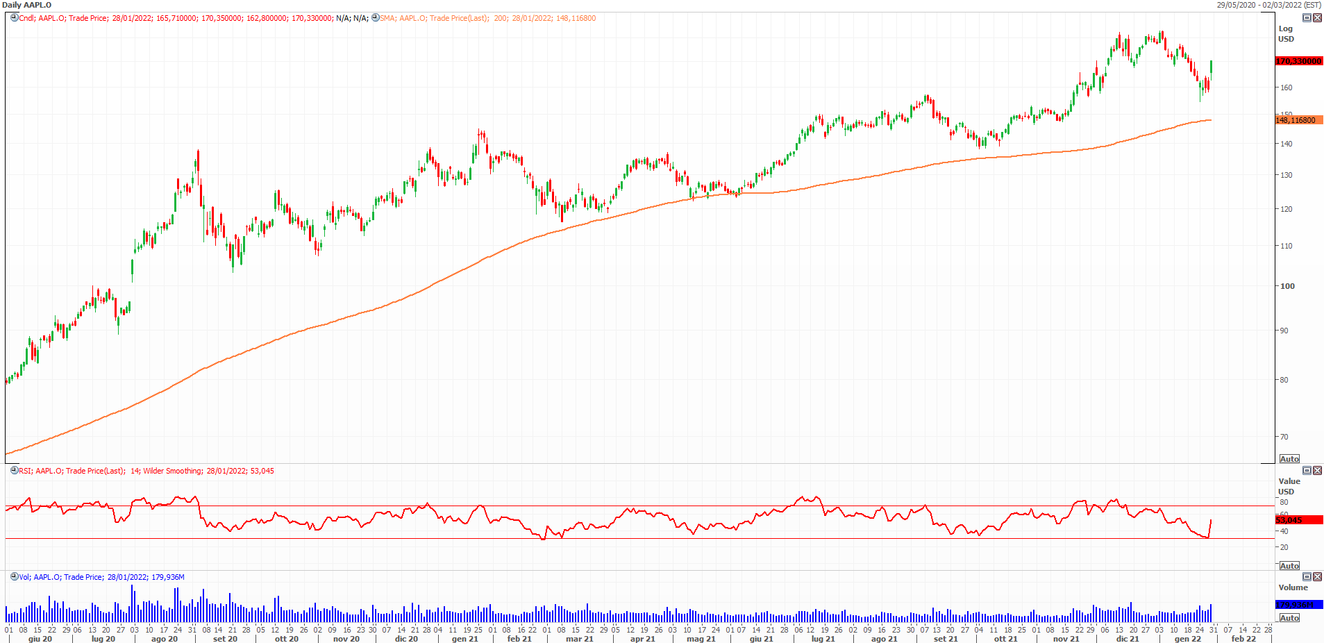 Newsflow. Apple prosegue positivamente a Wall Street dando manforte ai titoli tech USA. La società ha avuto un’impennata dopo che il suo record di 123,9 miliardi di dollari di vendite nel primo trimestre ha battuto le stime di Wall Street anche nel bel mezzo di una crisi delle forniture. I profitti hanno anche superato le proiezioni, spinti da nuovi prodotti tra cui l’iPhone 13. Il CEO Tim Cook ha incolpato i problemi di approvvigionamento per la mancanza di crescita dell’iPad, dicendo che questi problemi erano ancora più gravi che nel periodo precedente. Ma l’azienda ha visto record per il cloud, la musica, i video e i servizi di pagamento.