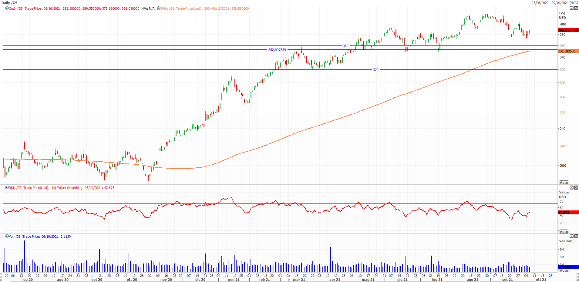 Scenario grafico. Goldman Sachs è in rialzo dello 0,5% a 389 usd, prima dell'apertura. Ieri ha chiuso a 388 usd, +0,6%. Il titolo, dopo aver toccato nuovi massimi storici a 420 dollari ha avviato una fisiologica fase di correzione. Il supporto di breve a 372 dollari ha tenuto e da qui potrebbero ripartire gli acquisti verso 400 usd e successivo sui massimi storici a 420 usd. In caso di cali, la fascia 350-360 è un'area di supporto molto importante.