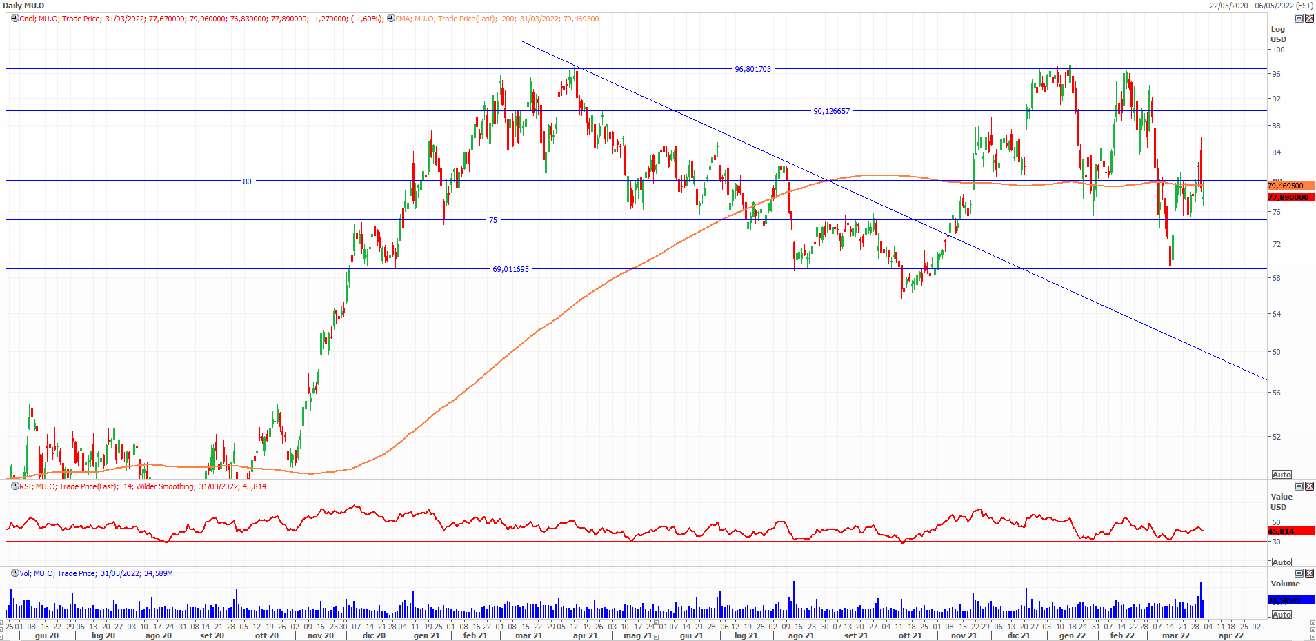 Scenario grafico. Micron Technology è stabile a 77,9 usd nel Pre Market. Ieri ha perso il 1,6% a 77,89 usd. Il titolo rimane inserito in un trading range compreso tra 96 e 70 usd. Dopo aver ritestato la parte bassa a metà marzo il titolo ha recuperato forza. La buona trimestrale dovrebbe consentire ulteriori allunghi, soprattutto se i tassi dovessero cominciare a scendere. Compriamo con target a 90 usd.