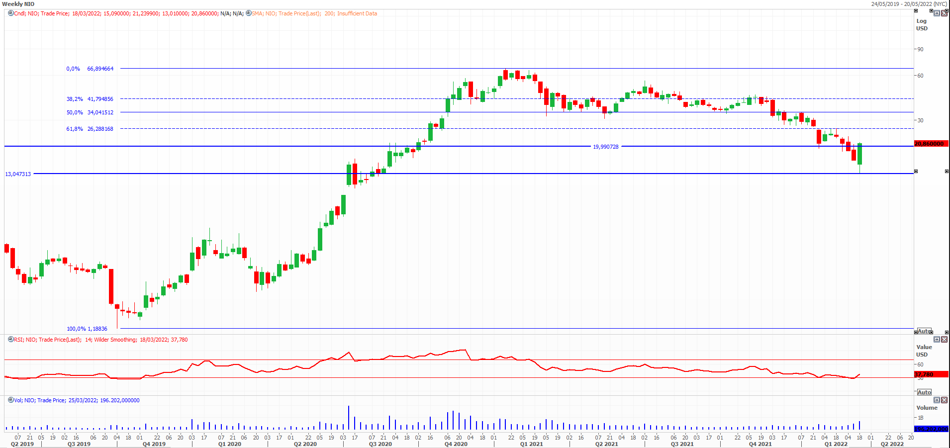 Scenario grafico. NIO ieri ha chiuso venerdì a 20,86 dollari (+10,8%). Oggi nel Pre Markets è -1,9%. Dopo i massimi in area 70 dollari il titolo ha avviato un forte ribasso che lo ha portato ad infrangere anche il 61,8% di ritracciamento di Fibonacci a 26,28 dollari. Il break ha confermato la debolezza di NIO avviando ulteriori ribassi fino al minimo di 13 usd, con una perdita dai massimi di oltre l'80%. Primi segnali di recupero di forza sono arrivati nelle ultime sedute anche se la strada da fare è ancora lunga. Venerdì il titolo ha infranto la resistenza dei 20 usd in chiusura con una seduta a forte volatilità e buona dose di volumi. nel pre markets vediamo prese di profitto oggi. Qui i più aggressivi possono già aprire posizioni LONG, i più conservativi aspettare la conferma tra oggi e i prossimi giorni del superamento dei 20 usd. Faccio notare che se si mette un grafico settimanale è evidente l'engulfing rialzista, confermato anche dai volumi (vedi grafico sotto). Segnalo che l'engulfing rialzista sul settimanale è presente anche su indici sui titoli cinesi. un segnale molto importante per il settore.