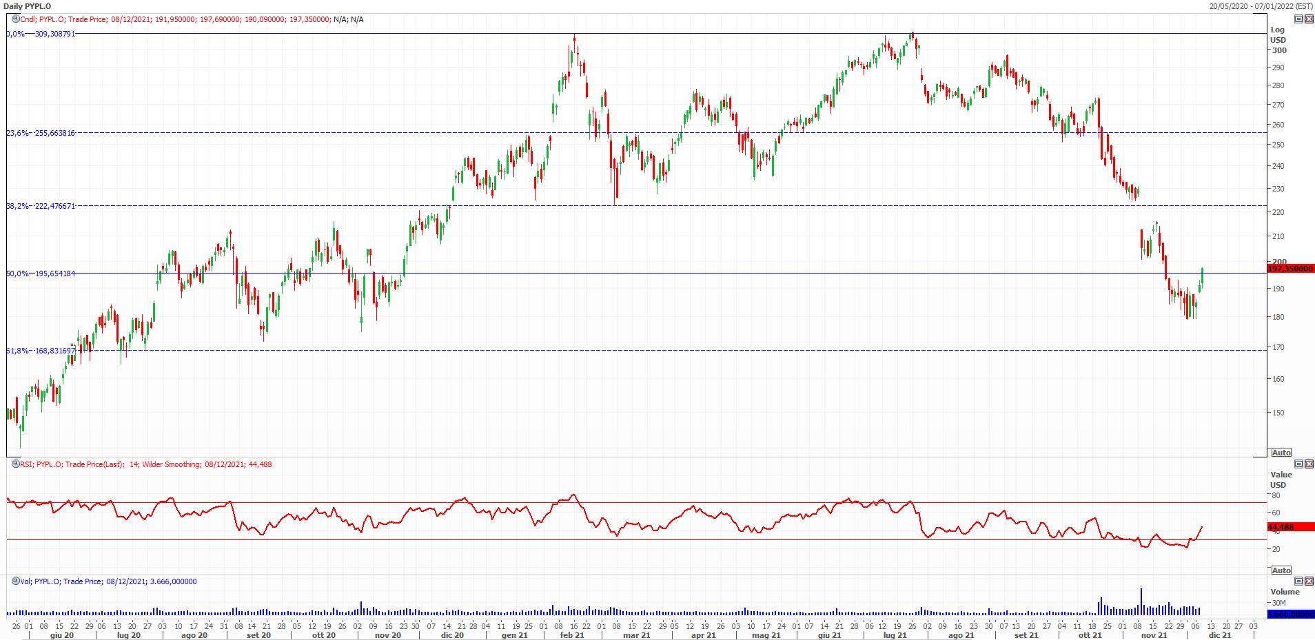 Operatività multiday. LONG sull'azione sul break di 200/204 usd, comprando Leverage Shares Paypal ETP con leva +3x, Isin XS2297550217, per target short term a 210 usd e successivo a 222 usd. Allerta/stop loss sopra 195 usd (chiusura daily).