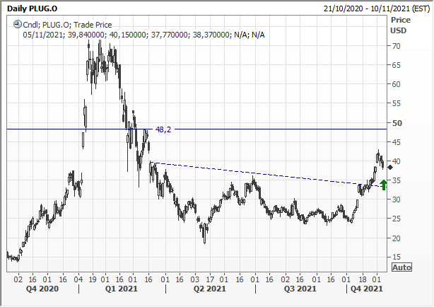 Scenario grafico. Plug Power sale del 3% a 39,5 usd nel pre-market. Il titolo ha infranto la resistenza statica collocata a 35 usd, in linea con l'imporante break avvenuto sull'indice di riferimento S&P Global Clean Energy. Primo target a 40 usd preso, ora obiettivo a 48,2 usd.