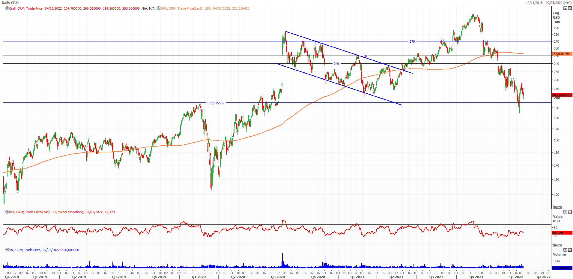 Newsflow. Gli attuali prezzi di Salesforce rendono interessante il titolo che mantiene ottimi fondamentali ma ha subito come tutti i tech le aspettative di politiche monetarie più restrittive. Potremmo assistere ad ulteriori ribassi verso 190-184 usd, ma questi sono livelli interessanti per provare un acquisto.