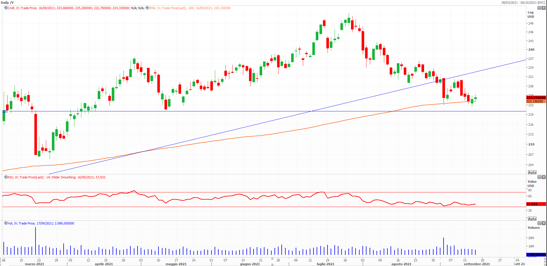 Scenario grafico. VISA è stabile a 224 usd, prima dell'apertura. Ieri ha chiuso a 224 usd, +0,5%. Il titolo Visa è uno dei titoli più efficienti americani evidenziando anche fondamentali estremamente solidi. I corsi dopo aver segnato nuovi massimi storici poco sopra 250 dollari ha invertito direzione avviando una fisiologica fase correttiva. A 220 dollari risiede un primo supporto chiave che può essere usato per strategie long su questo titolo.