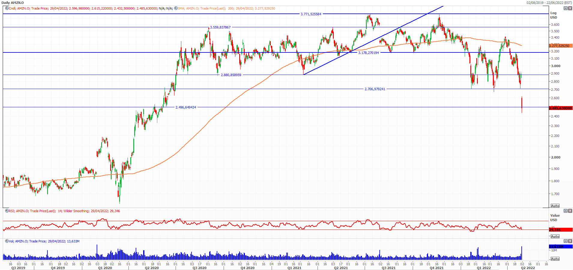 Operatività multiday. SHORT sull'azione sulla chiusura sotto 2.500 punti, comprando Leverage Shares Amazon ETP con leva -1x, Isin IE00BKT66S86, per target short term verso 2.300 usd. Allerta/stop loss sopra 2.700 usd (chiusura daily).