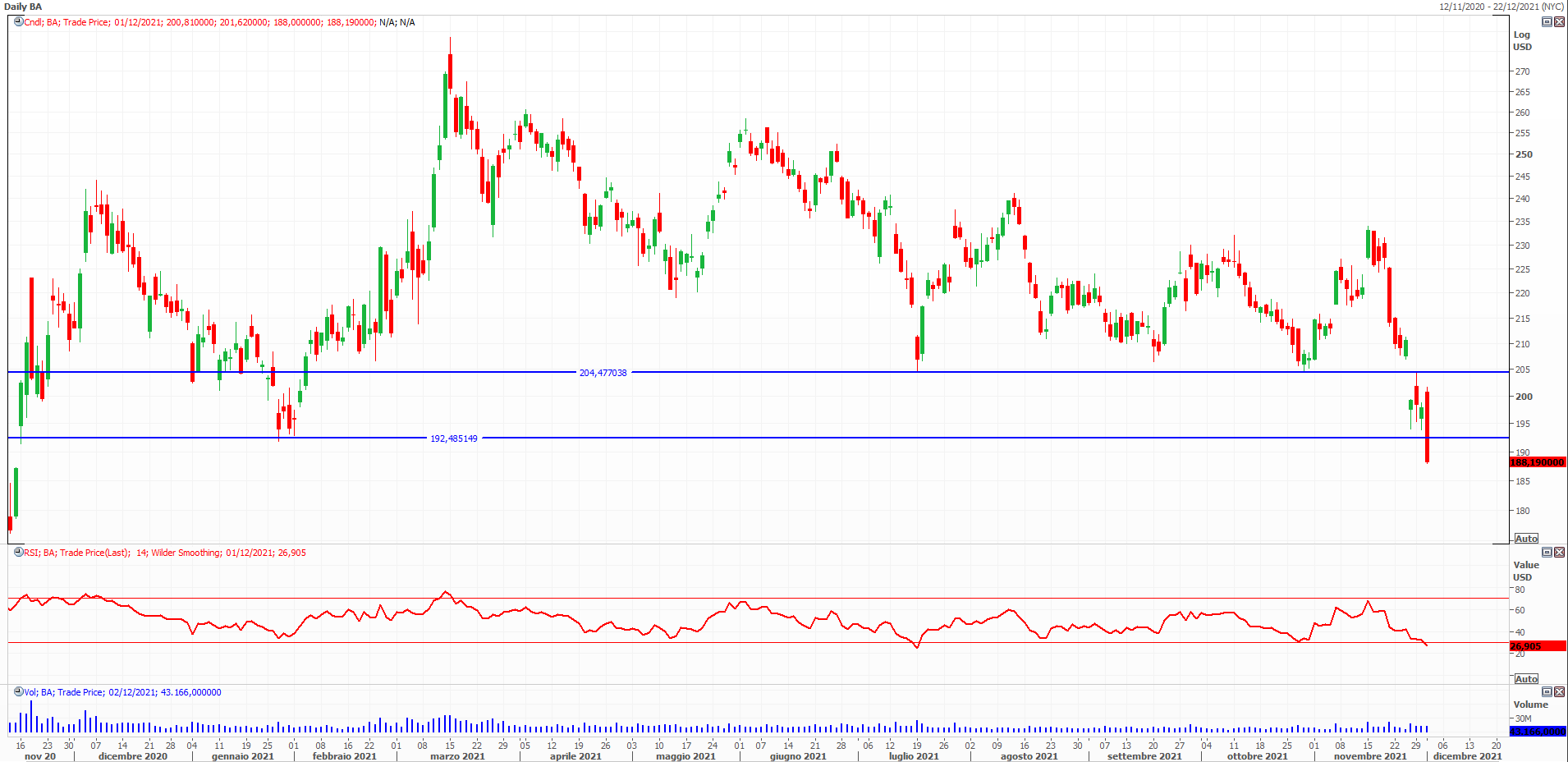 Operatività. SHORT sull'azione in caso di conferma oggi sotto 192 usd, comprando Leverage Shares Boeing ETP con leva -1x, Isin XS2297551454, per target verso 178 e 160 usd. Allerta/stop loss sopra 200 usd (chiusura daily).
