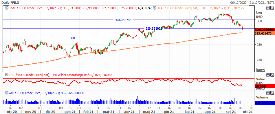 Scenario grafico. Facebook sale dello 0,9% a 329 usd, prima dell'apertura. Ieri ha chiuso a 326,2 usd, -4,9%. Graficamente il titolo ha rotto ieri in chiusura il supporto 330 dollari, dando un segnale ribassista di breve.