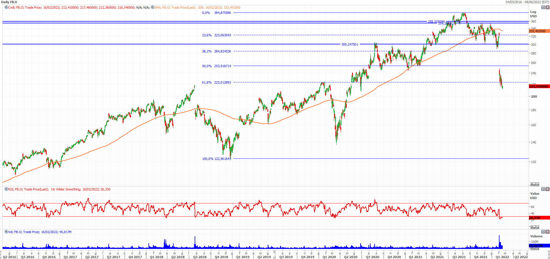 Newsflow. Non una fase facile per Meta Platforms tra situazione difficile legata in generale ai tech, per le politiche restrittive avviate dalla Fed (mercato sconta quasi 7 rialzi quest'anno) e lo scontro con Apple e ora anche Samsung sul tema tracciamento delle pubblicità.