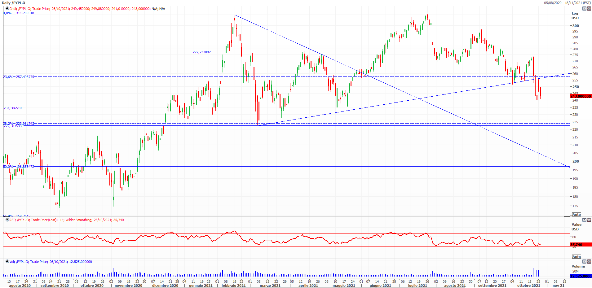 Scenario grafico. Paypal , chiusura a 243 usd, -1,6%, ora -0,1% nel Pre Market a 242 usd. Dopo i massimi di luglio a 310 dollari il titolo ha avviato una fase di correzione piuttosto importante. Il target finale potrebbe essere in area 220 usd, visto soprattutto l'accelerazione delle ultime due sedute sostenuta da forti volumi e volatilità. Tra l'altro facciamo notare che a 220 dollari passa anche il ritracciamento di Fibonacci del 38,2% di tutto l'up trend avviato a marzo 2020. Traget di brevissimo a 230 usd.