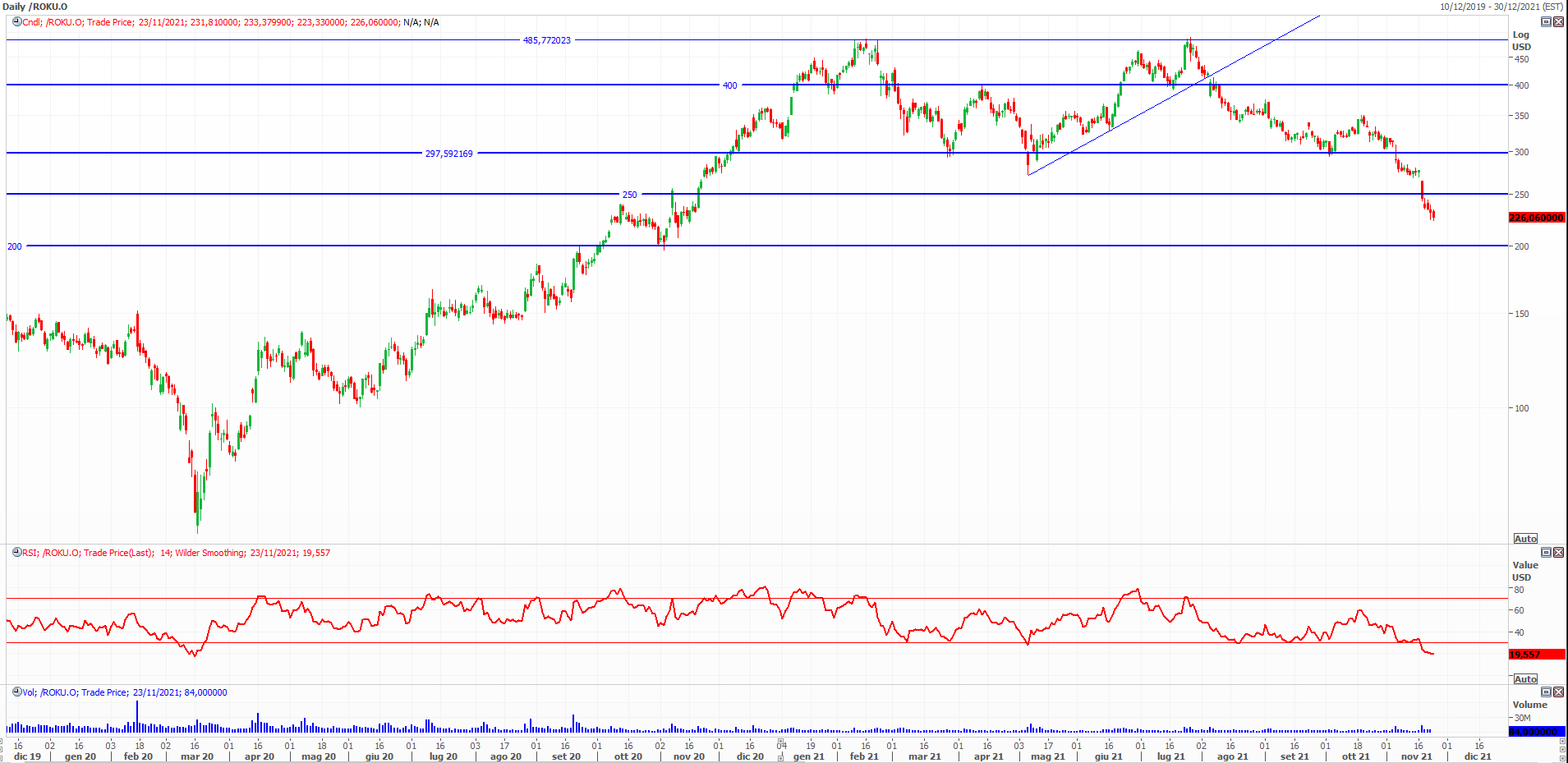 Operatività. SHORT sull'azione, comprando Leverage Shares Roku ETP con leva -1x, Isin XS2337087634, per target verso 200 usd. Allerta/stop loss sopra 250 usd (chiusura daily).