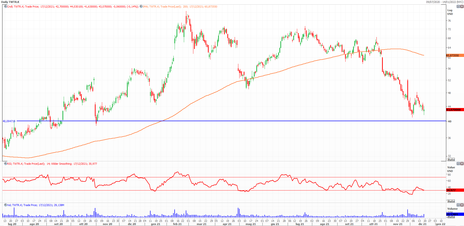 Operatività. SHORT sull'azione, comprando Leverage Shares Twitter ETP con leva -1x, Isin IE00BKT66N32, per target verso 40 usd. Allerta/stop loss sopra 45 usd (chiusura daily).