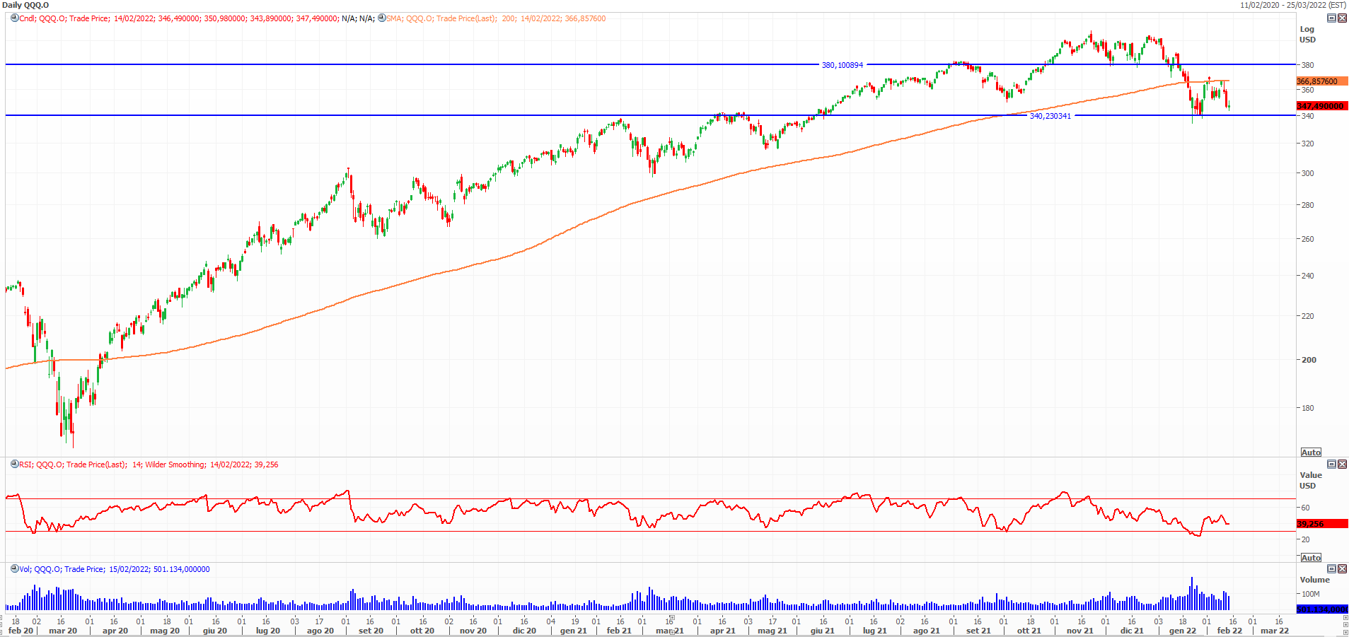 Scenario grafico. Per investire sul tech USA ci sono sicuramente diverse strade. In questa rubrica vi proponiamo un'analisi grafica su fondo Invesco QQQ Trust e, come strumento per cavalcare il megatrend, gli ETP di Leverage Share con cui è possibile andare a leva sia long che short. Da un punto di vista tecnico, cresce l'incertezza di breve e medio periodo sull'indice, tale per cui si consiglia operazioni mirate di breve termine. In questo, i prodotti a leva possono aiutarci e fare la differenza. Avevamo evidenziato i livelli sia per un long che per uno short in attesa del dato sull'inflazione americana. L'indice ha preso una direzione al ribasso, anche se per aprire lo SHORT è meglio attendere il break in forza (quindi con volatilità e in chiusura di seduta) dei 14.000 punti di Nasdaq, pari a 340 usd dell'ETF QQQ Trust.