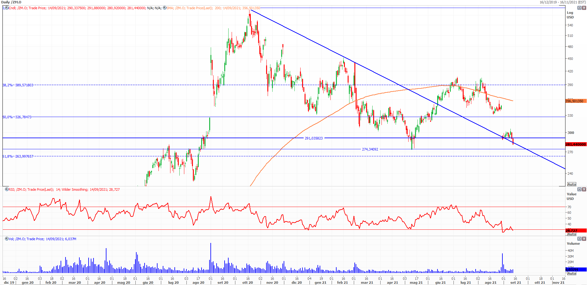 Newsflow. Dopo il tracollo 31 agosto quando il titolo ha perso il 17%, diversi analisti hanno tagliato la raccomandazione sul titolo. Ultimo della lista Citigroup che ha tagliato il target price a 304, da 380 dollari. La ragione è stata che la società di videoconferenze aveva segnalato un calo della domanda più rapido del previsto e gli analisti hanno messo in dubbio i suoi piani futuri.