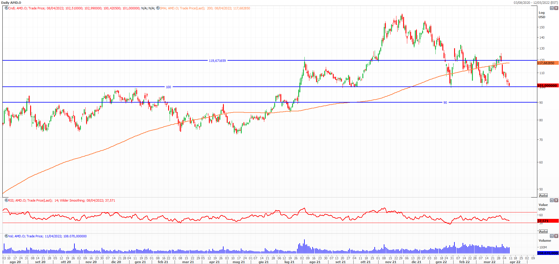 Scenario grafico. AMD è in calo del 1,2% a 99,76 usd nel Pre Market. Venerdì ha chiuso a 101 usd. Graficamente la situazione è molto chiara. Il titolo si è riportato sul supporto chiave, uno spartiacqua importantissimo a 100 usd. Dal luglio 2021 infatti AMD è rimasta sempre al di sopra di tale livello. Ora l'eventuale break in volatilità darebbe un segnale short importante, mentre la ripartenza darebbe un segnale utile ad un long. La strategia quindi è duplice e si attiva ai seguenti livelli in funzione del comportamento del titolo nei prossimi giorni. Attiveremo lo short sul break di volatilità e con volumi di 100 usd (la figura in tal caso ricorda il testa e spalle ribassissta con neck line a 100 usd) e target 90 usd, mentre attiveremo il long al superamento in chiusura di 106 con target a 115 e 130 usd. Monitoriamo nei prossimi giorni la situazione per decidere cosa fare.