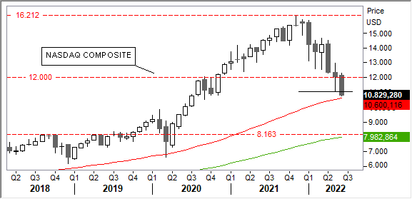Venerdì scorso il NASDAQ Composite ha portato a termine la nona settimana negativa delle ultime dieci con un bilancio in rosso del -5,60%. La notizia che l'inflazione statunitense nel mese di maggio (+8,60%) ha toccato il livello più alto da 40 anni potrebbe portare l'indice alla decima settimana in rosso su undici.