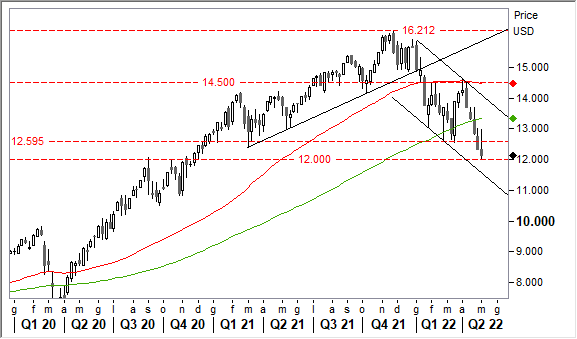 Analisi tecnica Nasdaq Composite. Il Nasdaq (12.144 punti prima dell'apertura) ha in corso una prolungata fase correttiva che non sembra essersi ancora esaurita del tutto. Il cedimento di area 13.300 punti (media mobile in verde) e il cedimento di area 12.595 punti (primo supporto statico di rilievo) hanno peggiorato il quadro di breve.