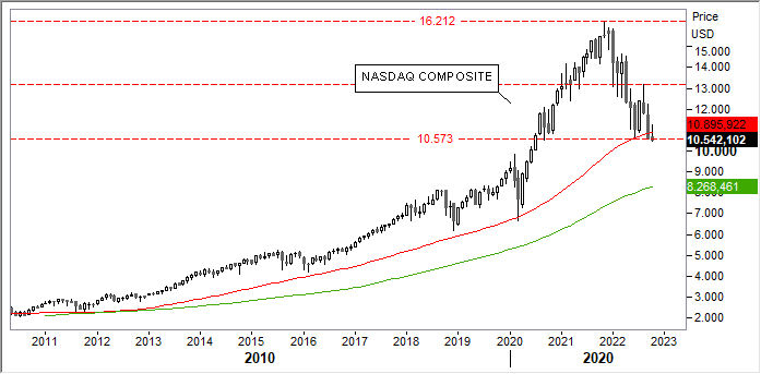 Analisi tecnica Nasdaq Composite. Il Nasdaq (oggi 10.542 punti) è scivolato sui minimi degli ultimi due anni, mettendo pressione al forte supporto statico in area 10.573 punti, rappresentato dal minimo dello scorso giugno. Una chiusura settimanale sotto questo livello aprirebbe la strada ad ulteriori discese anche fin verso 8.268 punti, dove transita la media mobile di lungo periodo sotto evidenziata in verde.