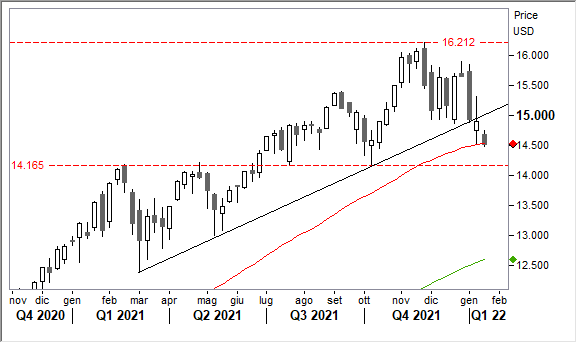 Analisi tecnica Nasdaq Composite. Il Nasdaq (14.506) ha chiuso sotto la media mobile a 200 giorni, una linea importante per il quadro grafico, ma sulla prima interessante area supportiva posizionata nel range 14.500/14mila, dove chi ha posizioni leggere può cominciare a collocare gli acquisti sulla debolezza.