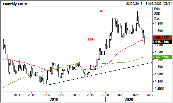 Negli ultimi due anni circa la tendenza si è mossa in laterale, nel range compreso tra il picco record in area 2.072 usd e il robusto sostegno statico in area 1.700/1.675 usd. Fino a pochi giorni fa questi livelli hanno fatto sistematicamente scattare movimenti in controtendenza, ma il cedimento di area 1.675 usd ha alterato lo scenario, portando il trend in territorio "orso" con oibiettivi finali intorno a 1.437 usd.