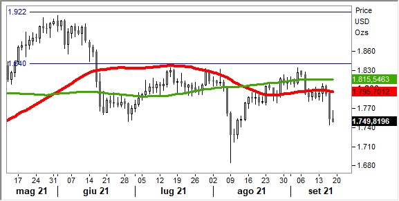 Operatività. Manteniamo una visione negativa. Si suggerisce di sfruttare allunghi in direzione 1.835 usd per vendere. Rientrare in acquisto solo verso area 1.700/1.675 usd, minimi di agosto, in ottica di trading per giocarsi l'opportunità di una reazione da ipervenduto.
