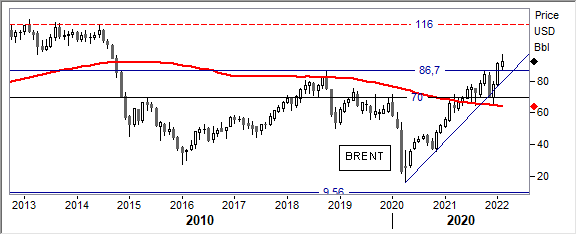 Analisi Tecnica. Le prime settimane del 2022 hanno rafforzato il quadro di fondo portando le quotazioni sui massimi dal 2014. E' aperta la strada a una risalita sui livelli massimi pre-pandemia indicati con la linea tratteggiata in rosso verso 116/105 usd rispettivamente. Tuttavia, l'accelerazione del movimento nelle ultime sedute è legata soprattutto a componenti speculative difficilmente controllabili e crediamo sia più saggio non inseguirle. Preferiamo attendere un assestamento/correzione per scaricare gli eccessi di breve. Un accordo sul nucleare, che consentisse all'Iran di tornare sul mercato con tutto il suo potenziel potrebbe far scivolare il prezzo in area 80 usd.