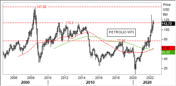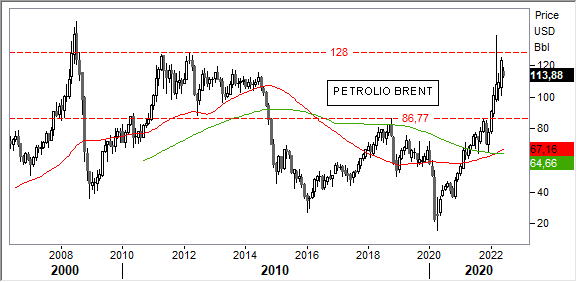 Analisi Tecnica. L'impostazione di fondo rimane saldamente rialzista, ma i prezzi si stanno avvicinando rapidamente ad un'area di ostacoli grafici di valenza crescente, per il Brent tra 128/147 usd, per il Wti tra 114/147 usd.