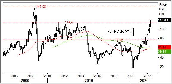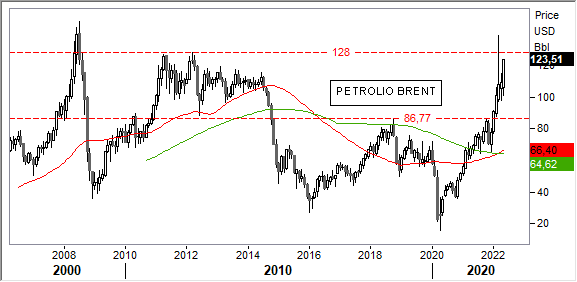 Analisi Tecnica. L'impostazione di fondo rimane saldamente rialzista, ma i prezzi si stanno avvicinando rapidamente ad un'area di ostacoli grafici di valenza crescente, per il Brent tra 128/147 usd, per il Wti tra 114/147 usd.
