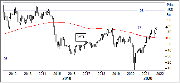 Operatività. Manteniamo una visione positiva in ottica di lungo periodo. Il Brent ha rotto l'area dei precedenti massimi dell'anno verso 78 usd e sembra puntare all'ostacolo successivo in area 87 usd, top del 2018. Il Wti ha violato il primo importante ostacolo grafico verso 77 usd, top di luglio. Fissiamo un target di 86 usd per il Brent e un target di 83 usd per il Wti. In direzione opposta, si suggerisce di approfittare di correzioni verso 78 e 75 usd rispettivamente per comprare sulla debolezza.