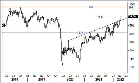 L'indice Stoxx Oil & Gas (oggi 332 punti) ha confermato la rottura della soglia discriminante in area 300 punti, massimo degli ultimi due anni toccati lo scorso mese di ottobre, e sta mettendo pressione alla successiva area resistenziale posizionata verso 330 punti. La rottura di questo livello riproporrebbe scenari di potenziale estensione dell'uptrend fino ai livelli pre-covid in area 367 punti.