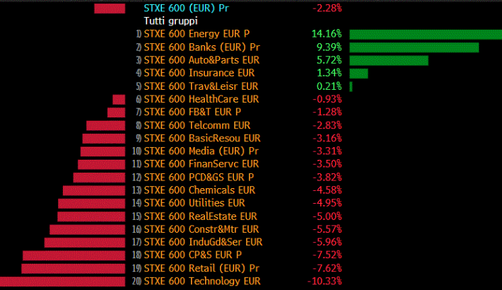 Il rally del petrolio e l'accelerazione della crescita dell'economia globale hanno fatto ripartire uno dei settori più trascurati da inizio anno: nell'ultimo mese ha messo a segno un balzo del 14,16% vs il -2,28% registrato dall'indice Stoxx 600. Solo le banche riescono a rimanere in scia con un +9,40%. Agli estremi opposti i Tech: -10,33%.