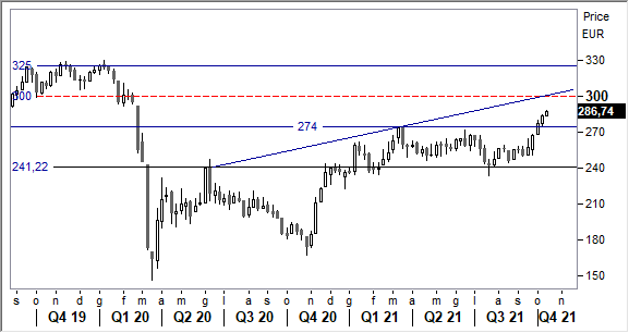 L'indice Stoxx Oil & Gas (286,7 punti) ha fornito negli ultimi giorni nuovi segnali di forza con il superamento convinto dei precedenti top annuali a 274 punti. A questo punto il target si sposta sui livelli pre-covid in area 367 punti con due obiettivi intermedi a 300 (trendline crescente) e 325 punti.